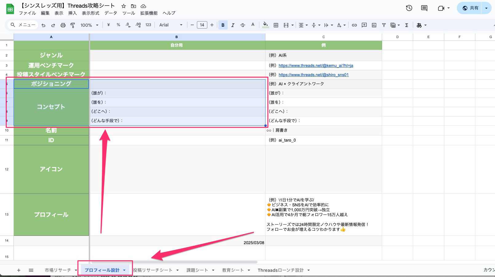 [プロフィール設計]シートにある「ポジショニング」「コンセプト」に考えた、ポジショニングとコンセプトを記入してください。
