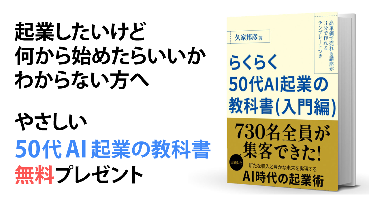 それは書籍『らくらく50代AI起業の教科書』を【無料】で手にいれる道です。